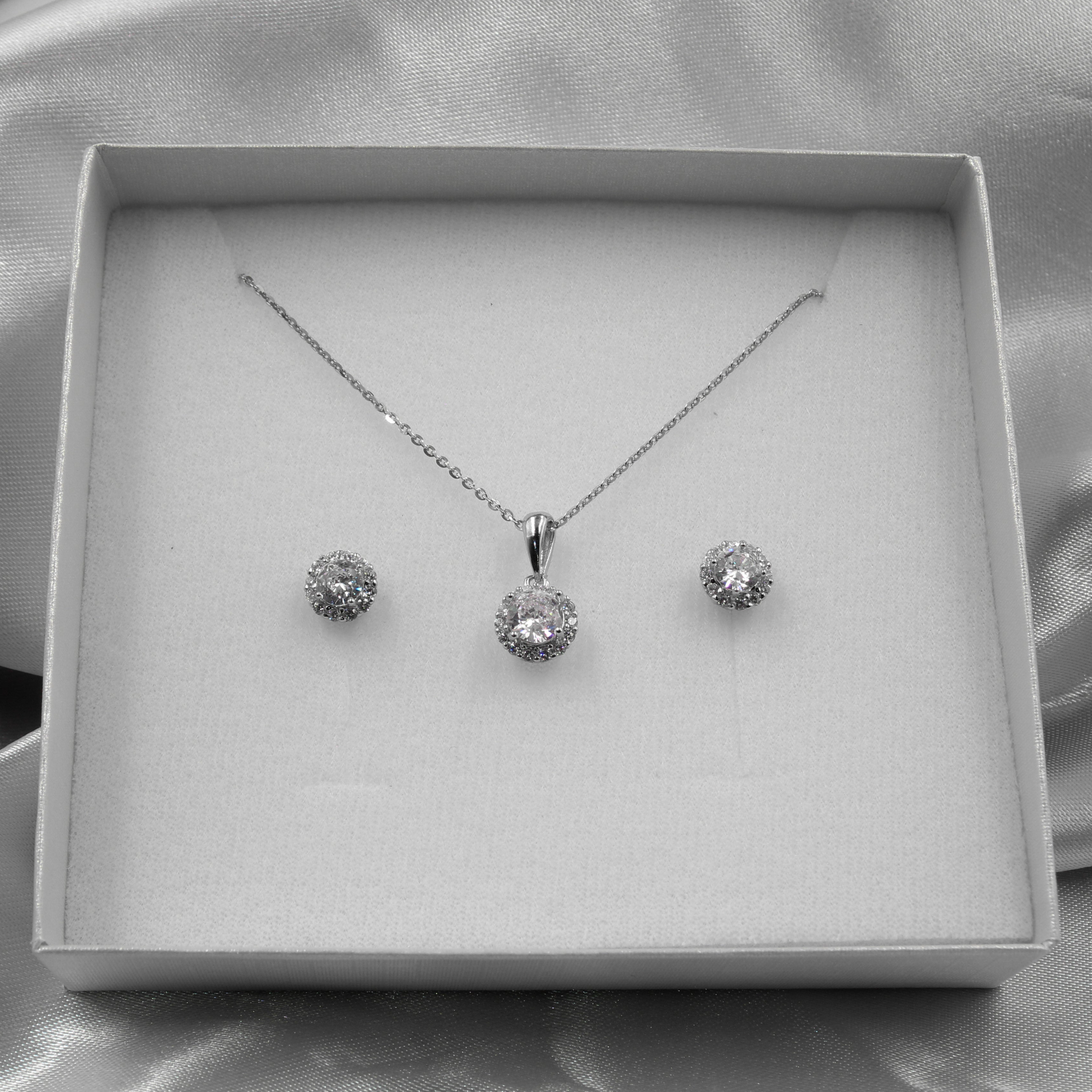 JUEGO DE ARETES Y COLLAR DE ROSETA PERFECTA CUBIERTA POR MINI ZIRCONIAS.